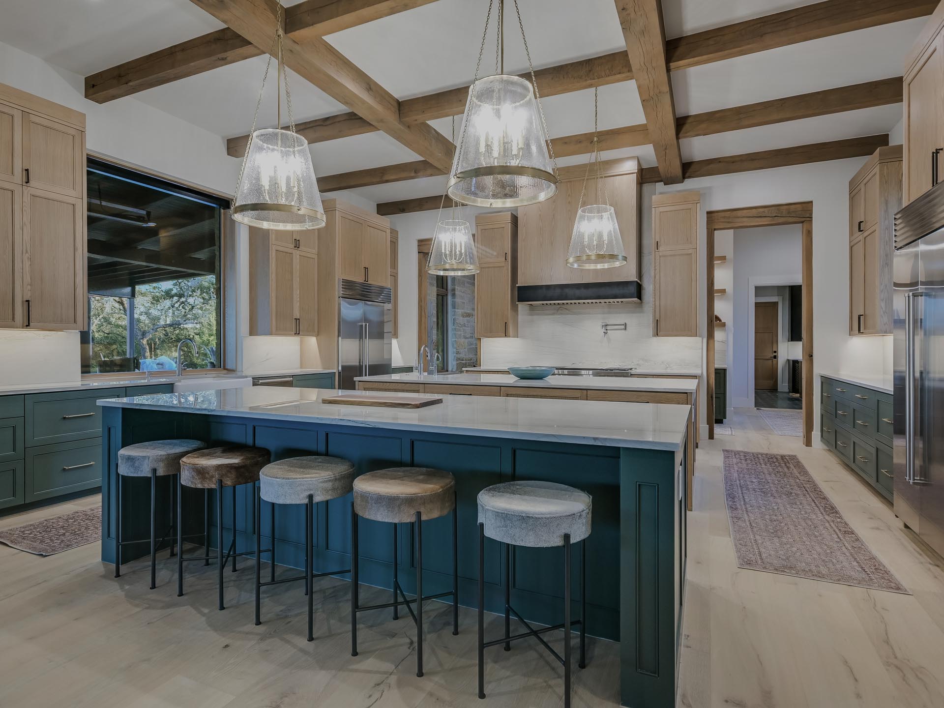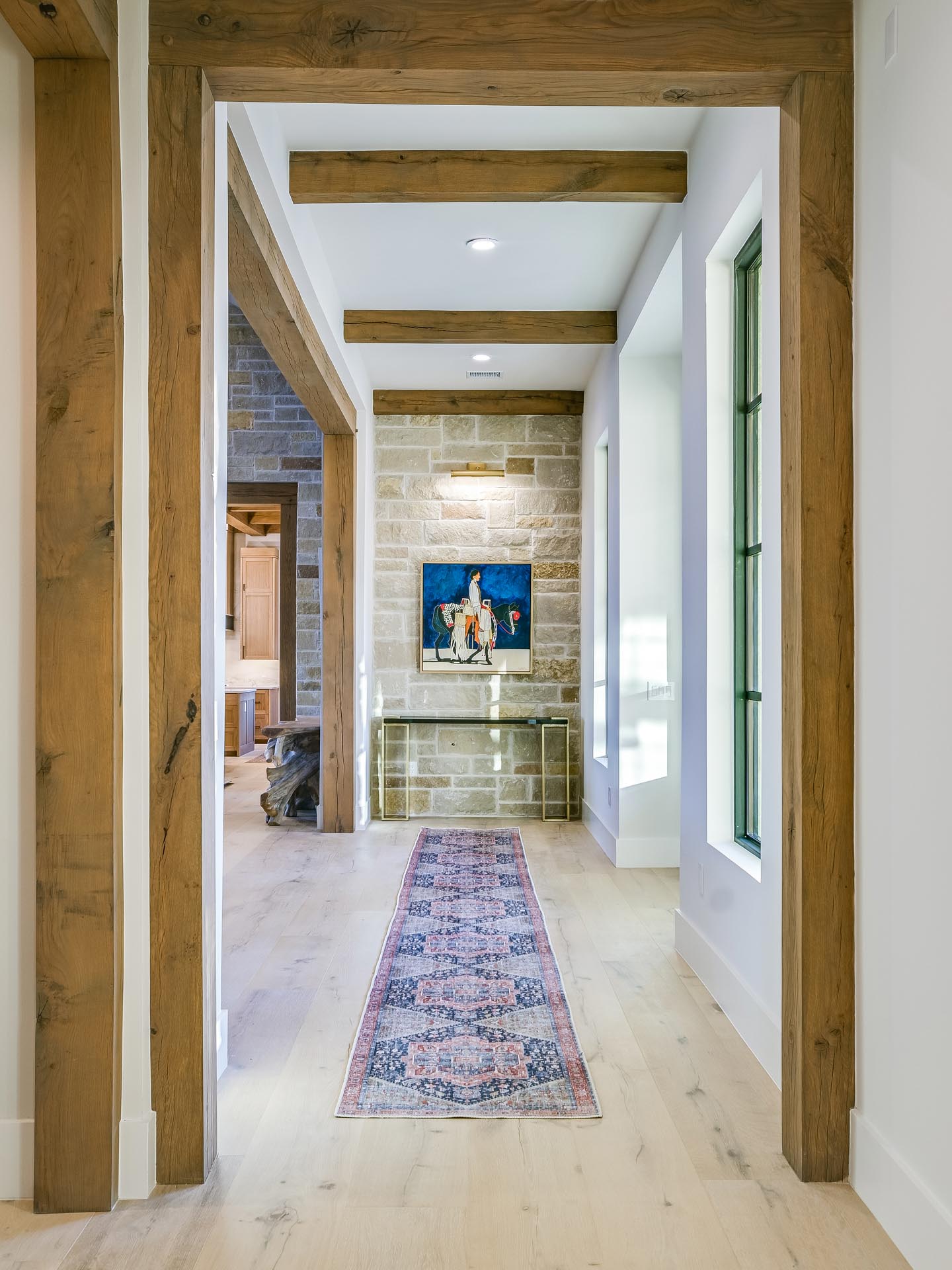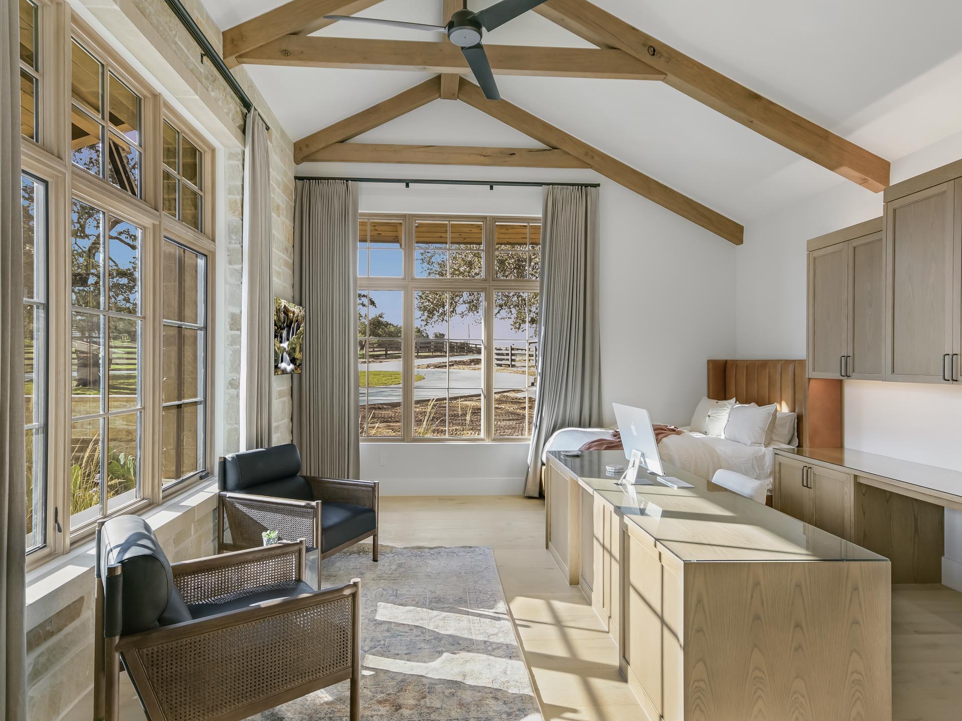 Gentle light filters across warm oak beams and textured fabrics, giving the home a balanced feel—open, grounded, and refined.