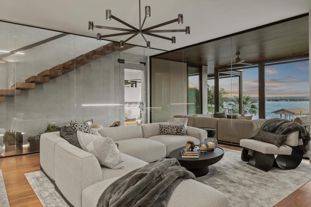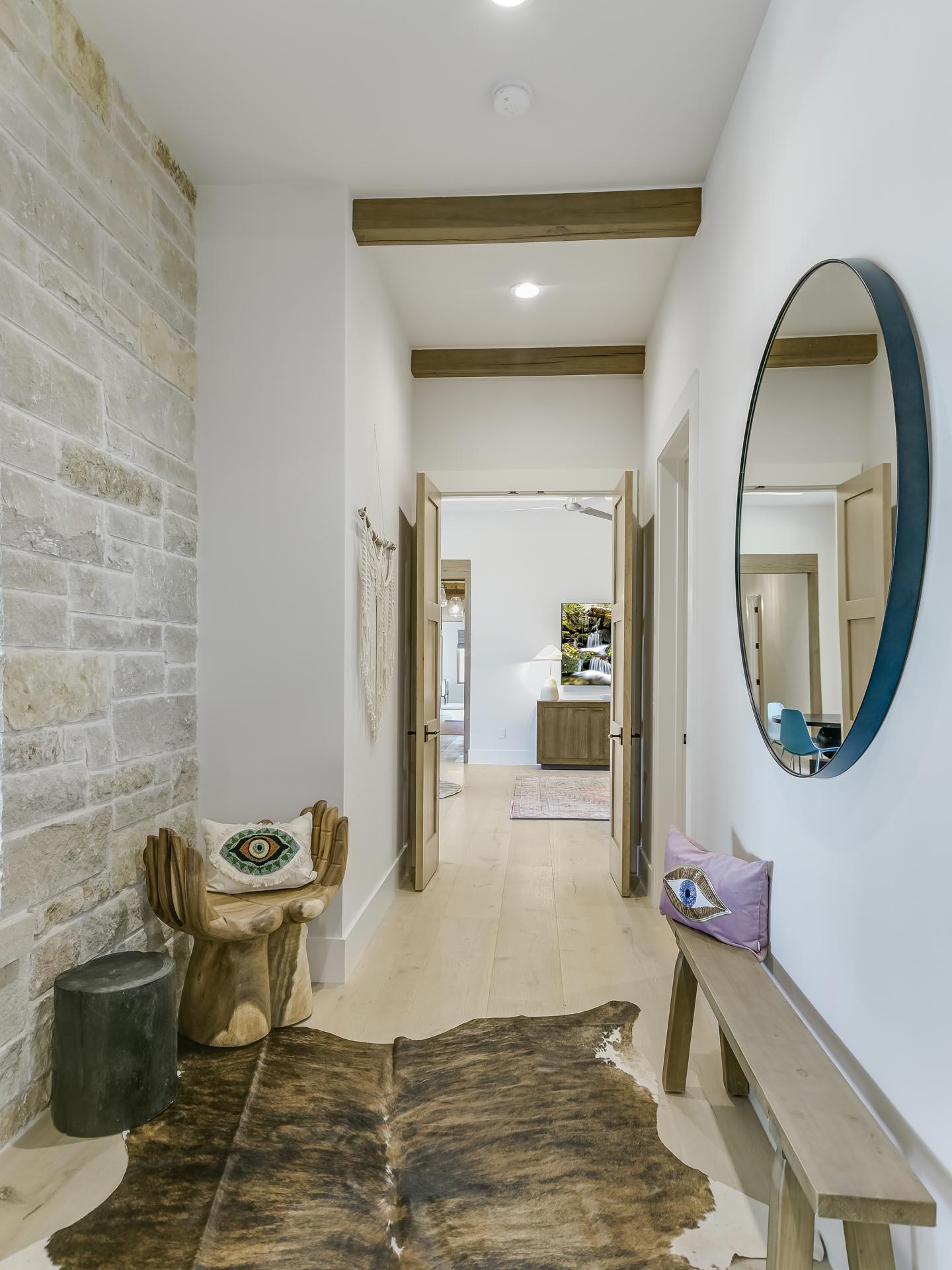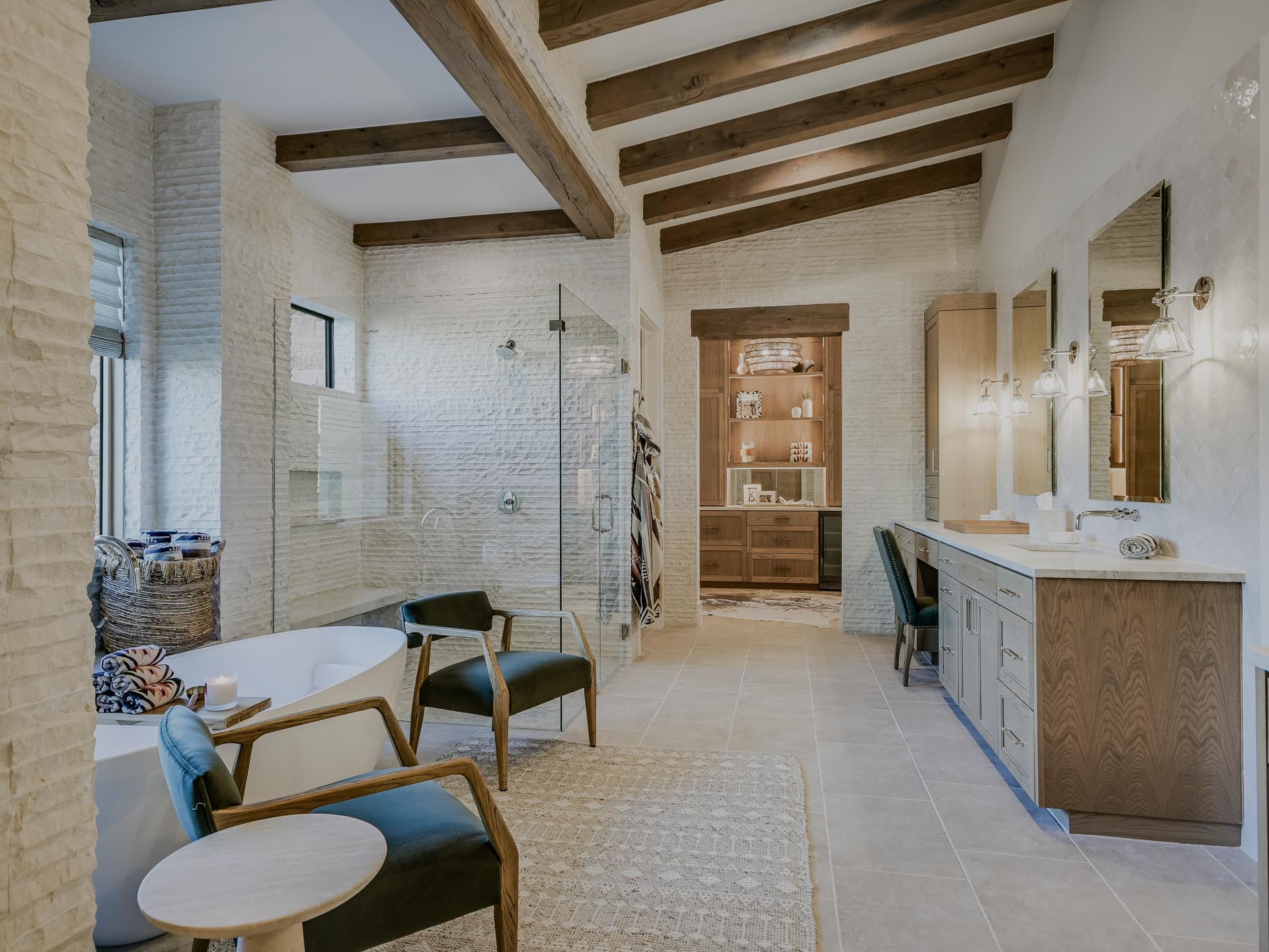 Gentle light filters across warm oak beams and textured fabrics, giving the home a balanced feel—open, grounded, and refined.